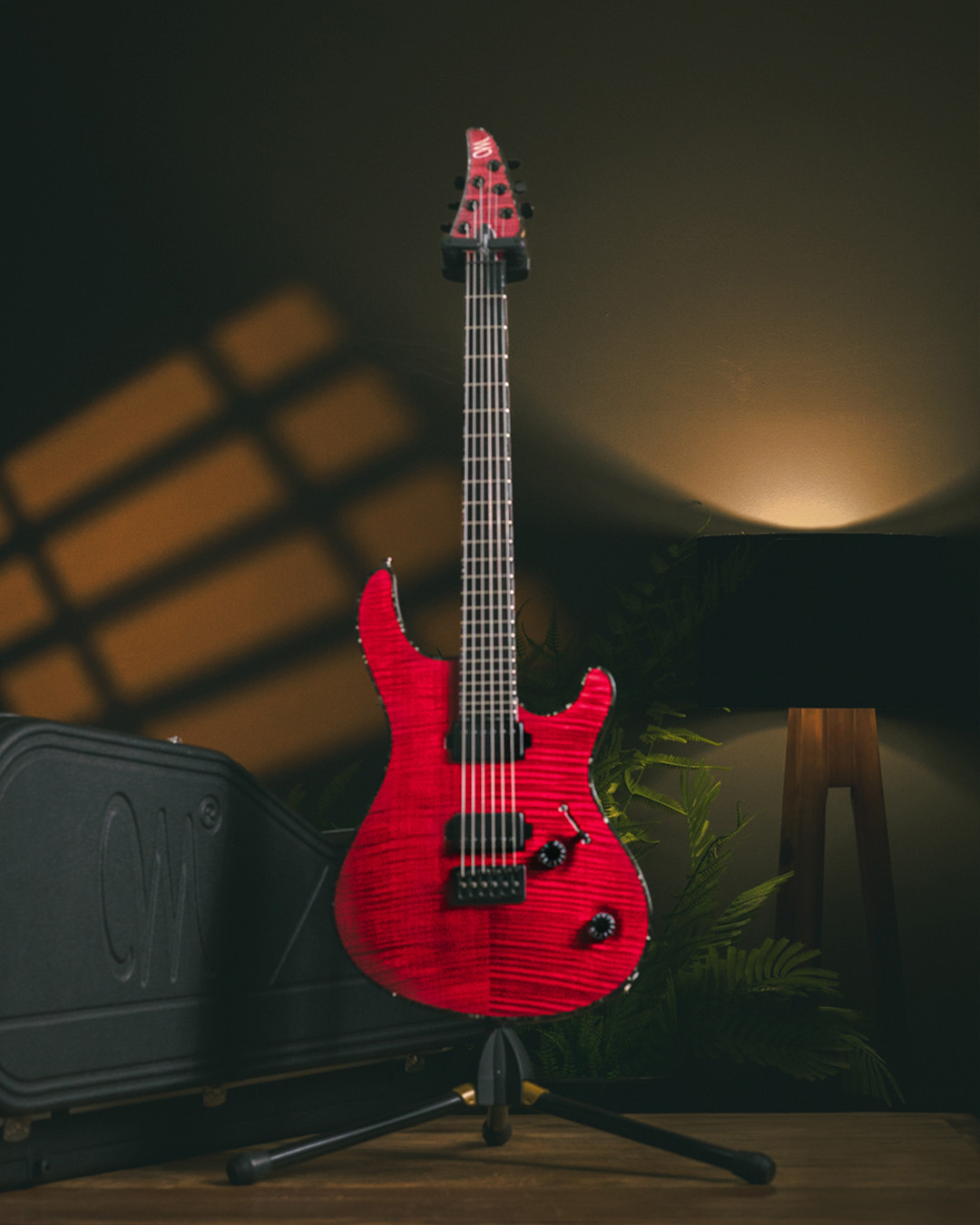 O acabamento Trans Cherry Gloss evidencia o tampo em Flamed Maple 3A, enquanto a construção multilaminada do braço contribui para maior rigidez estrutural e estabilidade de afinação ao longo do tempo.